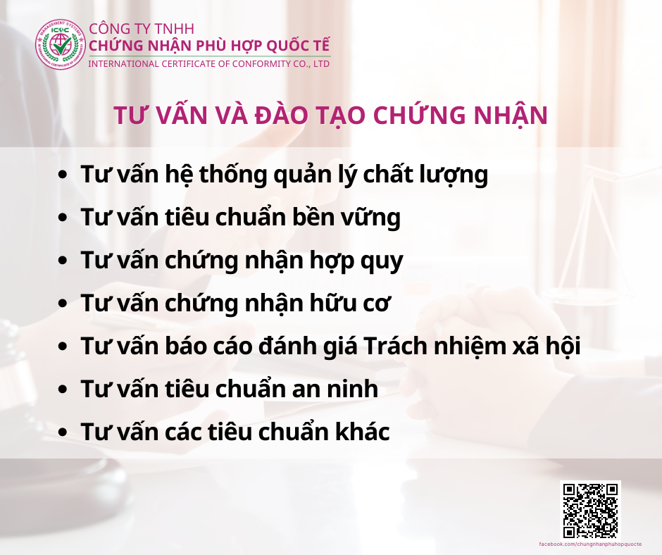 CÔNG TY TNHH CHỨNG NHẬN PHÙ HỢP QUỐC TẾ (ICOC) hoạt động trong lĩnh vực tư vấn chứng nhận chất lượng và các tiêu chuẩn liên quan. Dưới đây là những lĩnh vực chính mà ICOC chuyên tư vấn và hỗ trợ: