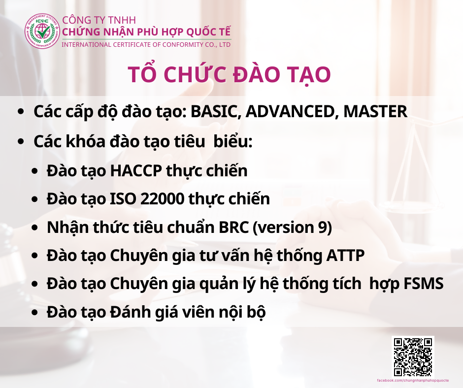 ICOC tổ chức các khóa đào tạo chuyên sâu, bao gồm cả khóa học lý thuyết và thực hành, nhằm giúp học viên hiểu rõ về các tiêu chuẩn chất lượng và quy trình chứng nhận. Chúng tôi tùy chỉnh nội dung đào tạo để phù hợp với từng lĩnh vực và yêu cầu cụ thể của doanh nghiệp. Các khóa đào tạo của chúng tôi có nhiều cấp độ, từ cơ bản đến nâng cao, nhằm đáp ứng nhu cầu đào tạo của học viên.